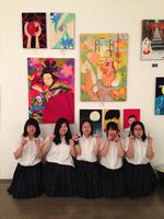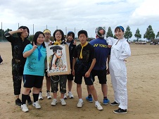 副部長のHさんは「千葉デザイン展」で特別賞をいただいたため、授賞式のため不在。そこでHさんのお面をつけ、代理でK先生(巨体)に走って描いてもらいました。リレー後に描き上げた作品とパチリ。どやっ!