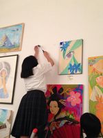 高い位置に作品を飾るため、脚立にのぼり、壁にくぎ打ちをし、展示作業をしました。
