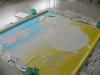 かなりサイズが大きいため、床に新聞紙を敷き、ねかせて着色しています。