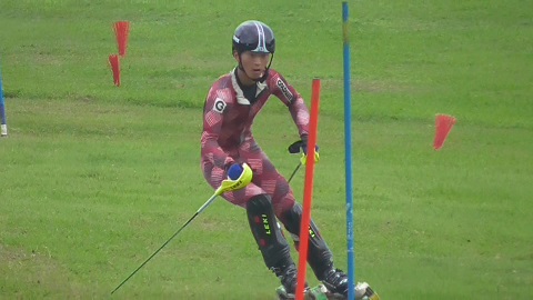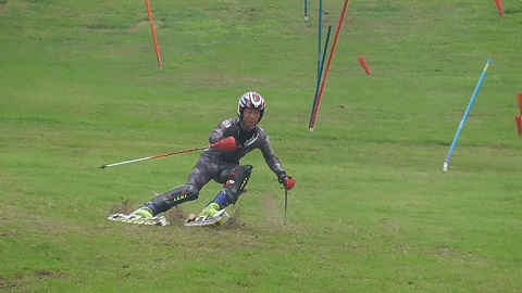 ジャンプ競技やクロスカントリー競技ではサマージャンプやローラースキーなど夏の競技会が開催されます。アルペン種目ではグラススキーの世界選手権大会などがあります。この夏、グラススキーに部員が挑戦しました。グラススキーは芝の上を専用の道具で滑りおりるスポーツです。ゲートがセッティングされタイムが競われます。ちょっと雪の上の感覚と違い、部員も戸惑いながらのトレーニングでしたが、二日目になると男子部員はゲートに入りました。