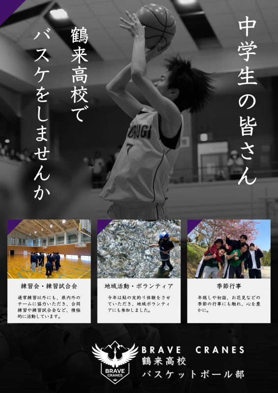 中学生の皆さん、鶴来高校で一緒にバスケットボールをやりませんか。今なら皆さんは即戦力です。