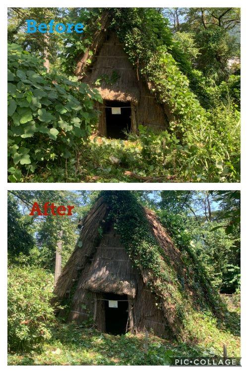 遊歩道の掃除や復元された竪穴住居、周辺の木のつた下ろしを中心に2時間ほどの活動でした。
