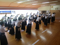 ▲開講式の様子 ▲受講者全員で肩周りの体操 ▲射技指導+射込みの様子