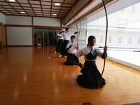 巻藁に矢を打ち込む練習をしました。佐野コーチから道場への入り方、礼の仕方、弓道の歴史から精神まで諄々と説明していただきました。矢の持ち方、構え方などは部長や副部長も丁寧に指導しました。中学生たちは初めて放った矢が巻藁の的に当たると、嬉しそうにしていました。練習用のゴム弓をお土産に持って帰りました。電車を待つ時間みな熱心にゴム弓を引っ張っていたそうです。