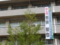 3月の全国高校選手権大会3位、4月の全日本カデ選手権2位の若狭選手の健闘を讃えて、職員玄関前に懸垂幕を設置していただきました。ありがとうございました。