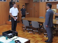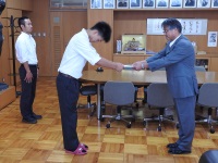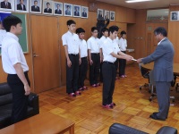 2019年6月13日 14時46分 昼休み、校長室にて北信越大会に出場する部活動の代表が校長先生から激励費を手渡されました。どの部の生徒も、自分のベストが尽くせるようにと気合の入った抱負を述べてくれました。例年よりたくさんの部活動が北信越大会に参加するので大変喜ばしい限りです。