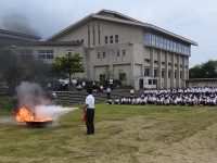 2019年7月8日 17時03分 今日は6限の途中に地震が起こり、そこから火災が発生した想定で避難訓練が行われました。2日後に行われる県下一斉防災訓練シェイクアウト石川も兼ねています。生徒が火災発生時、教室からグラウンドまで全員が集合するのに5分かからず、静かに迅速に移動することができ、消防の方にもお褒めの言葉を頂きました。実際の消火器を使った消火訓練も各クラス代表によって滞りなく行われました。