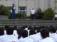 今日は6限の途中に地震が起こり、そこから火災が発生した想定で避難訓練が行われました。2日後に行われる県下一斉防災訓練シェイクアウト石川も兼ねています。生徒が火災発生時、教室からグラウンドまで全員が集合するのに5分かからず、静かに迅速に移動することができ、消防の方にもお褒めの言葉を頂きました。実際の消火器を使った消火訓練も各クラス代表によって滞りなく行われました。