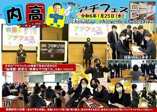 本日、アチフェス2024が開催されました。課題探究活動の成果を発表し、そして、他学年の発表を見ることができ新たな発見があったのではないでしょうか。様々な課題(テーマ)があることが分かっただけでも知識となりました。今日、堂々と発表できたことは、必ず良い経験となります。本日は、地域の方、評議委員の方にもお越しいただきました。発表を見ていただきありがとうございました。