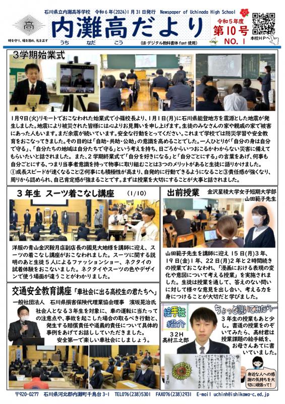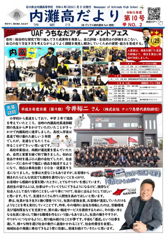今回の「内灘高だより」は「3学期始業式」「UAFうちなだアチーブメントフェス」「交通安全教育講話」「スーツ着こなし講座」などです。また「先輩訪問コーナー」では9期生今井裕二さん(株式会社ナニワ急便代表取締役)の仕事内容や後輩たちへのメッセージも掲載しています。ご一読ください!