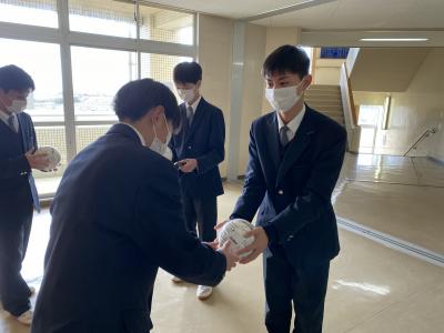 本来であれば、部員全員でお渡ししたかったのですが、この状況下ですので生徒会長であり、部長の樋(22H)より卒業式終了後に一言を添えて手渡しをすることができました。