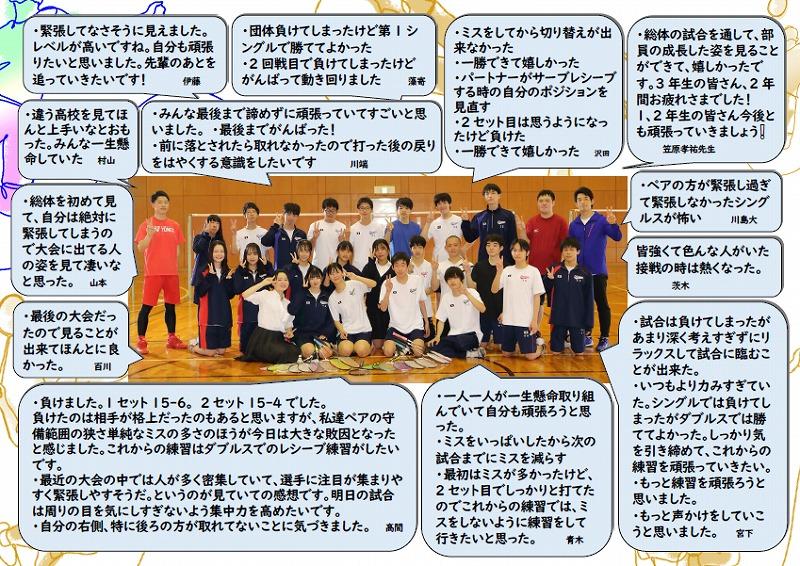 3年生最後の公式の大会で悔いの残らないように頑張ることができました。これまで部長として、上手くいかないこともあり、悩むことも多かったですが、乗り越えてきました。部長として、つらいこともあり、楽しいこともありました。1・2年生と一緒に部活をしてきて、みんなで頑張って来られたと思います。3年生と一緒に部活をしてきてどうでしたか?3年生が引退しても、1・2年生でぜひ頑張ってください。とくに2年生は、1年間はあっという間に感じられます。悔いの残らないように頑張ってください。