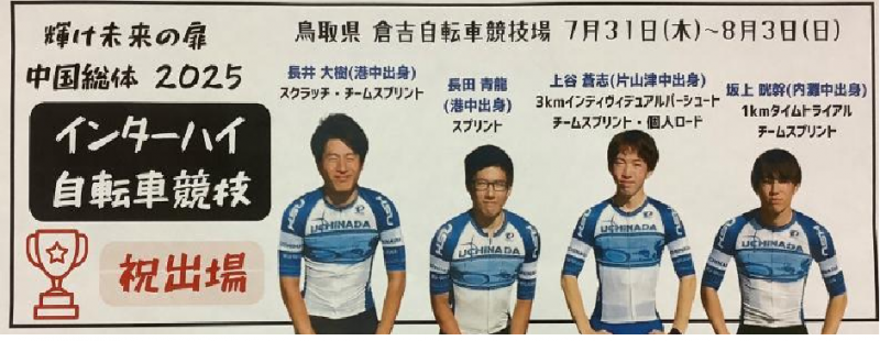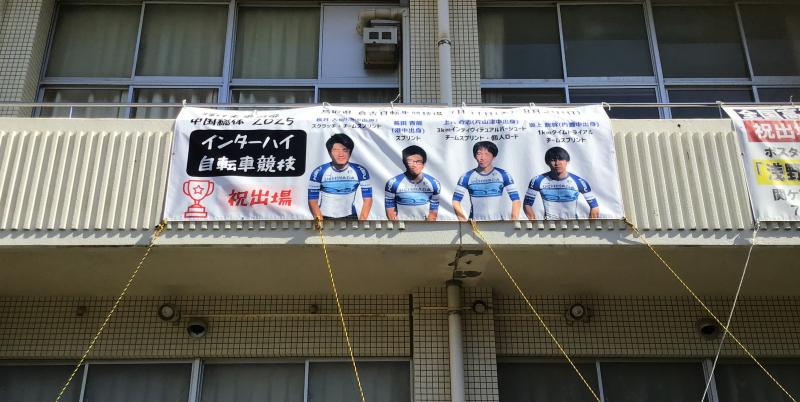 また、本校玄関横にインターハイ出場を決めた自転車競技部の横断幕を設置しました!7月31日から行われるインターハイ(中国総体)での活躍を期待します!