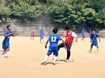 差し入れを頂いただけでなく、試合にも参加してもらいました。一緒に試合に向かうだけでも懐かしく、本当に嬉しくなりました。「応援される人になる」ことを目標に掲げているサッカー部ですが、先輩方の姿を在校生は見て「かっこいい」「こうなりたい」と思ってもらえるといいなと思います。夏休みの試合にはこの後もOBが来てくれる予定です。