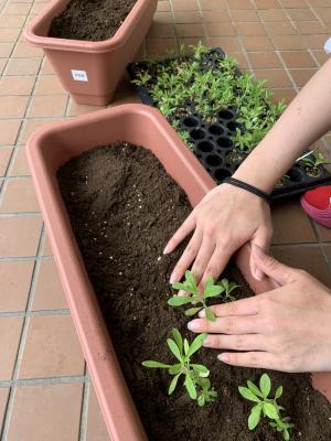 今週は保護者が植えたナデシコの苗をプランターに植え替えしました。