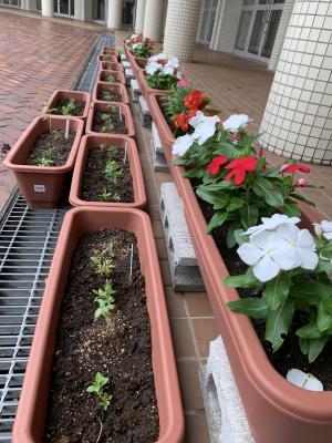 5月25日に生徒が植えた小さな粒の種から、各クラスのプランターに植え替えした苗がすくすく育ち、綺麗な花が咲き始めています。