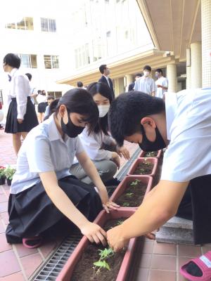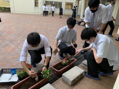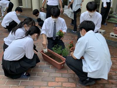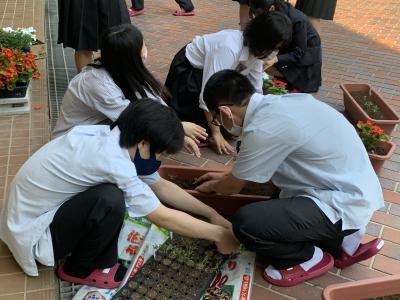 生徒は「暑くて汗が出て大変だったけど、皆で協力して花の植え替え作業に取り組めて良かった。」「これから植え替えた花が元気に育ってほしい。」「久々に土作業をして楽しかった。」と話していました。