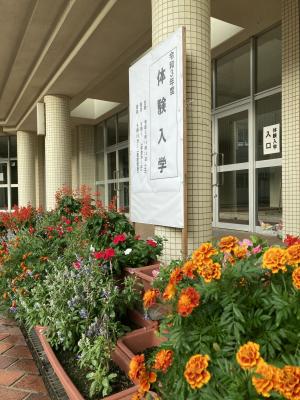体験入学の玄関をプランターの花☆花たちが飾り、中学生とその保護者の方々をお迎えしました。