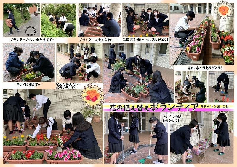 12日(木)生徒会役員のお花担当とボランティアの生徒で花の植え替え作業をおこないました。ボランティアで参加した生徒は終礼で「放課後に生徒玄関前の花の植え替えをするので手伝って」との呼びかけで集まってくれました。(^o^)
