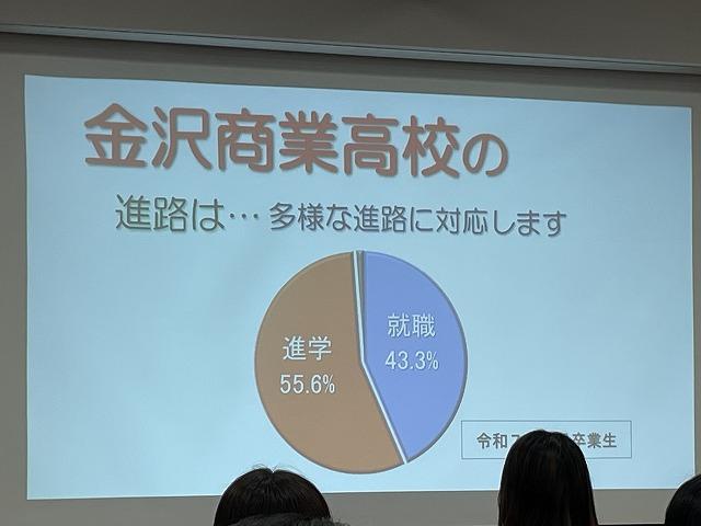 多様な進路に対応したコースを選択できることや、就職や進学、将来の仕事に生きる資格を取得できること等について説明していただきました。金沢商業高校の先生方、本当にありがとうございました。