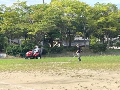 25日に行われる体育祭に備え、本日からグラウンドの整備を始めています。午後から降雨が予想されているため、朝から小村校長と校務員の中村さんによって除草作業を行っています。
