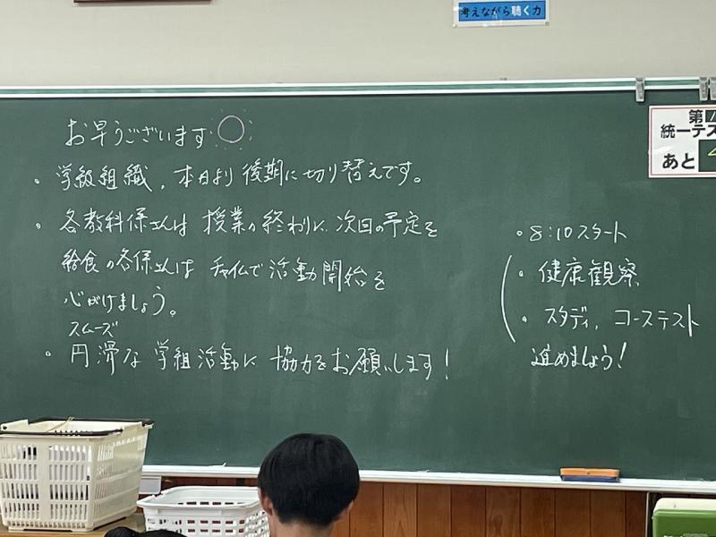 本日10/6(月)から各学級は後期役員・係に切り替えます。今日から、生徒の皆さんは新しい役割を頑張ってください。