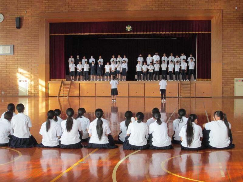 10/10(金)、放課後練習の2日目です。どの学年の生徒たちも頑張っていました。体育館ステージや生徒ホールは1日2クラスを前半・後半に分けて割り当てています。この日は他学年の合唱を見学する場面がありました。1年生は3年生の合唱を聴いて感じることがあったでしょうし、3年生も聴衆を前にして気持ちの張りもアップしていたと思います。