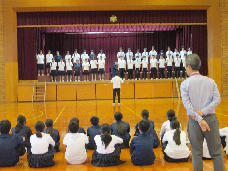 10/14(火)、放課後の合唱練習の3日目です。ここまで、生徒たちは主体的に練習に取り組んでいます。この日、生徒ホールで練習していた3年生のクラスでは、1曲歌い終わった後、すぐにリーダーたちが改善点について話し合っていました。