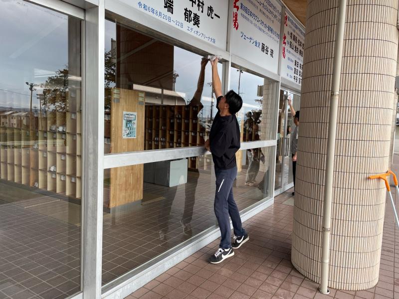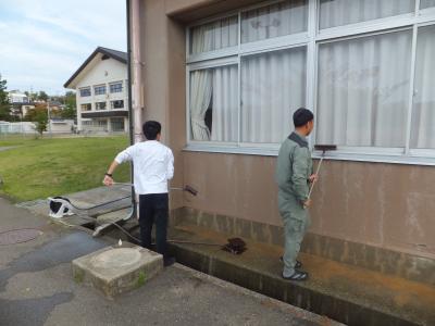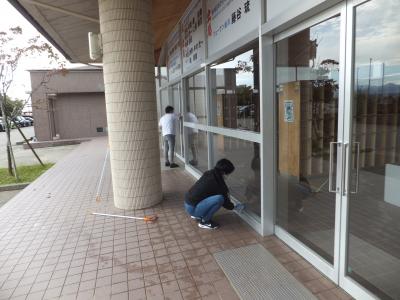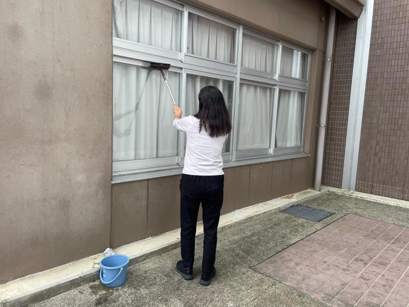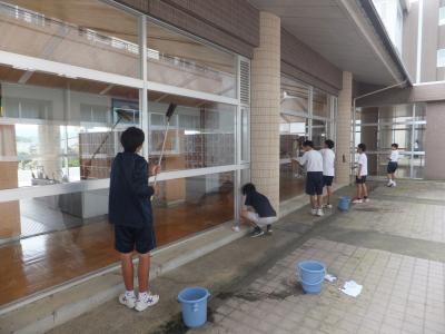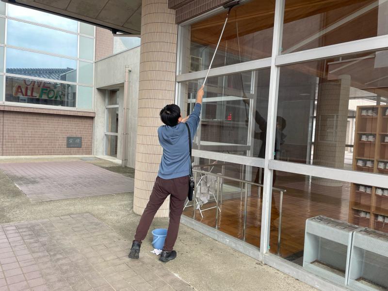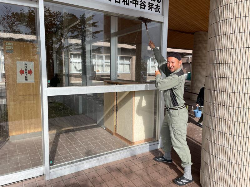 20名を超える保護者の皆様に来校いただき、生徒玄関をはじめ、外に面した校舎1階の窓を、一枚一枚丁寧に掃除していただきました。