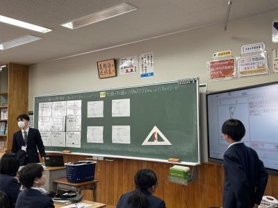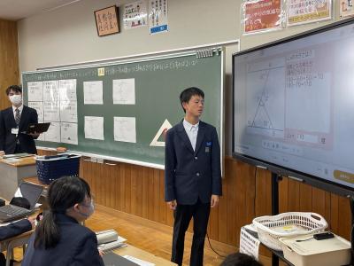 これまでに学習した図形の性質を使って、生徒たちは様々な補助線を引いて図形の問題に挑戦していました。「わかった、できた」が味わえる授業でした。
