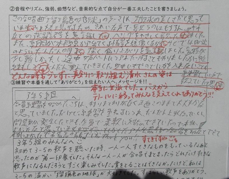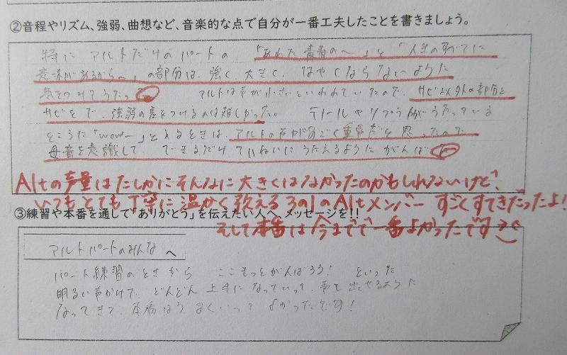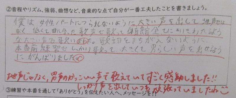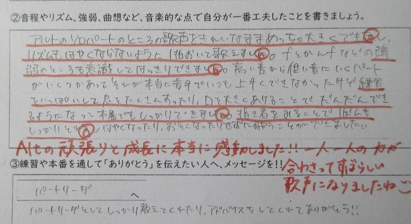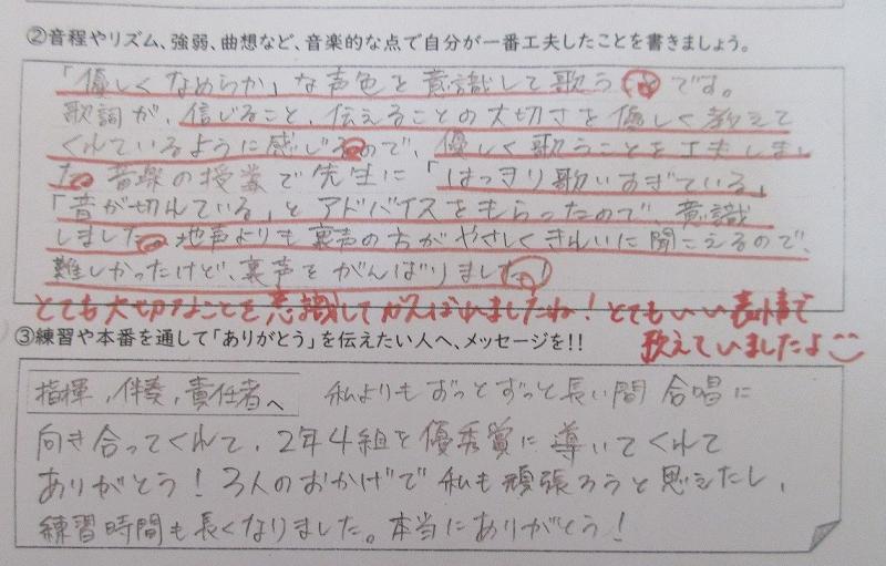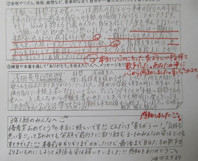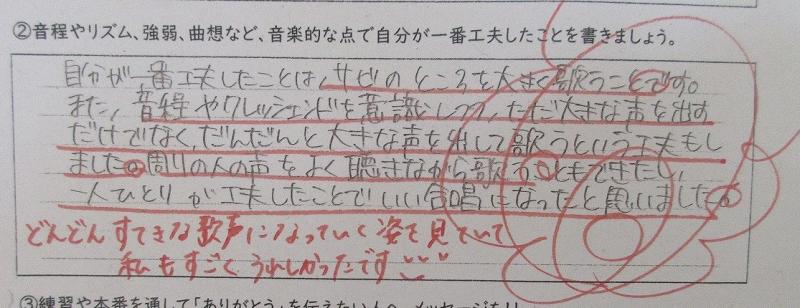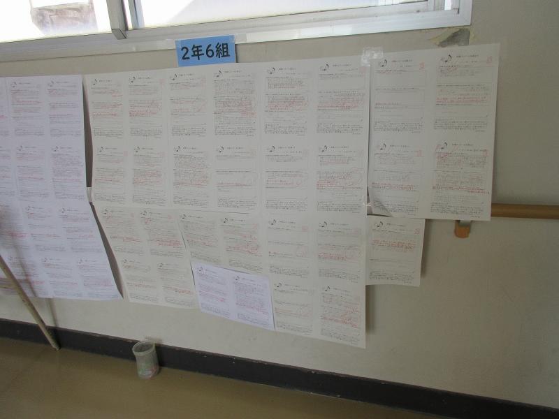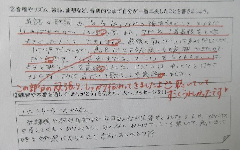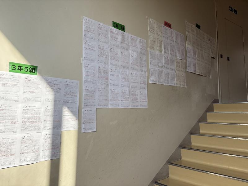 「合唱コンクールを終えて」 生徒たちの思い 2025年11月17日 11時13分 現在、音楽室前の廊下に、合唱コンクールについての生徒たちの振り返りが掲示されています。生徒それぞれが工夫したところや級友等への感謝の思いなどをつづった文章読むと、心がとっても温かくなります。