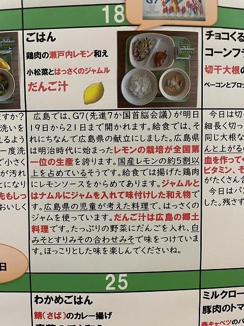 2023年5月19日 17時17分G7広島サミット開催に合わせ、5/18(木)の給食は広島県献立、広島の郷土料理「団子汁」などの美味しいメニューでした。