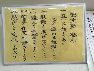 「原 勤堂」は,江戸時代末期,緒方洪庵の適塾に学び,故郷鵜川の地に「生成処」という私塾を開きました。本校は,この偉大な先人の教えを今に受け継ぐべく,当時の「塾則」を,各教室に掲げてあります。児童は,毎朝これを朗読し,一日の学習を始めています。