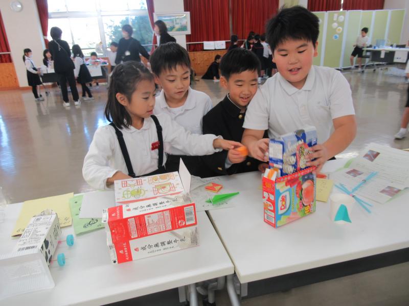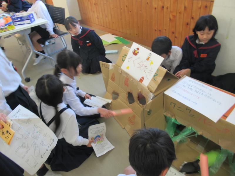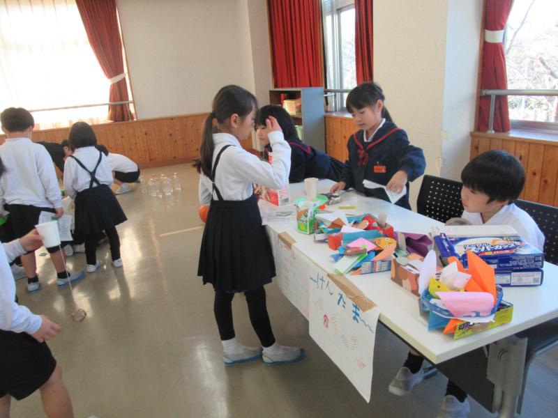 今週、2年生の各クラスで、1年生に向けておもちゃランドを開きました。11月の中頃より、おもちゃの製作をはじめ、どうすれば、もっと大きく動くおもちゃを作れるのか考えたり、どんなあそび方にすれば、1年生により楽しんでもらえそうなのか考えたりしてきました。また、同じグループの人と協力して、おもちゃ作りやルール作りに取り組むことができました。当日は、子どもたち主体で、司会進行を行い、1年生を案内するのもすべて2年生が行いました。自分の作ったおもちゃを楽しんでもらえるように、やさしく声掛けしたり、1年生と一緒に喜んだりしていました。おもちゃランドが終わった後、片づけをして、振り返りをしましたが、その時には、どの子も非常に満足した表情をしているのが印象的でした。振り返りにも、「1年生がたくさん遊んでくれてうれしかった」「おしえることがむずかしかったけど、かんそうタイムの時に、いろいろな嬉しいことを言ってくれてよかったです」といった感想が書かれていました。まだ、おもちゃランドを実施していない学級は、今後、実施する予定です。引き続き、ご協力をよろしくお願いいたします。