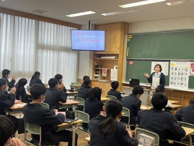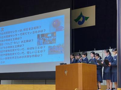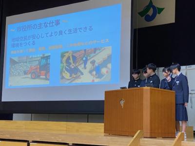 1年生は、9月に実施した「かほく市内の企業見学」を体験して、各グループでまとめたものを発表しました。砂丘農業センターを見学したグループの発表では「加賀しずく」は16年もの研究の結果作り出された梨であること、かほく市役所を見学したグループの発表では、市民が一番活用する課の場所は1階にあるなど、「なるほど~」「すご~い」などの声が聞こえていました。