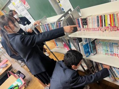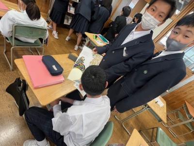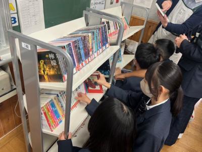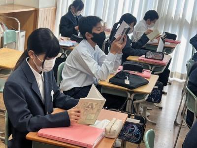 現在、かほく市内では「読書週間」を実施しており、1年生の国語の授業では「近代文学に触れよう」という課題で、学校図書館司書の向さんと一緒に学んでいました。
