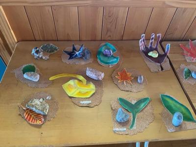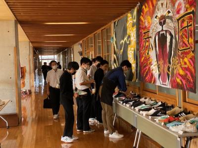 31日(金)、4日(火)7日(金)の3日間において、学校公開を予定しています。各学年のフロアや廊下には、生徒の様々な作品や感想等が展示してあります。2階廊下には、夏休みの課題の絵画、そして1年生の落ち葉と石、2年生のマイシューズが展示されています。