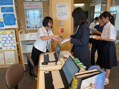 今週月曜日から開店した標記のCAFEが大盛況です。学校図書館司書の向さんが生徒に本を読んでほしいと考えた取組の一つで、一昨年から始めています。いろんなジャンルの本(0~8類)を借りるとしおりが1枚プレゼントされます。今日の昼休みは行列ができており、学年問わず本を借りていました。
