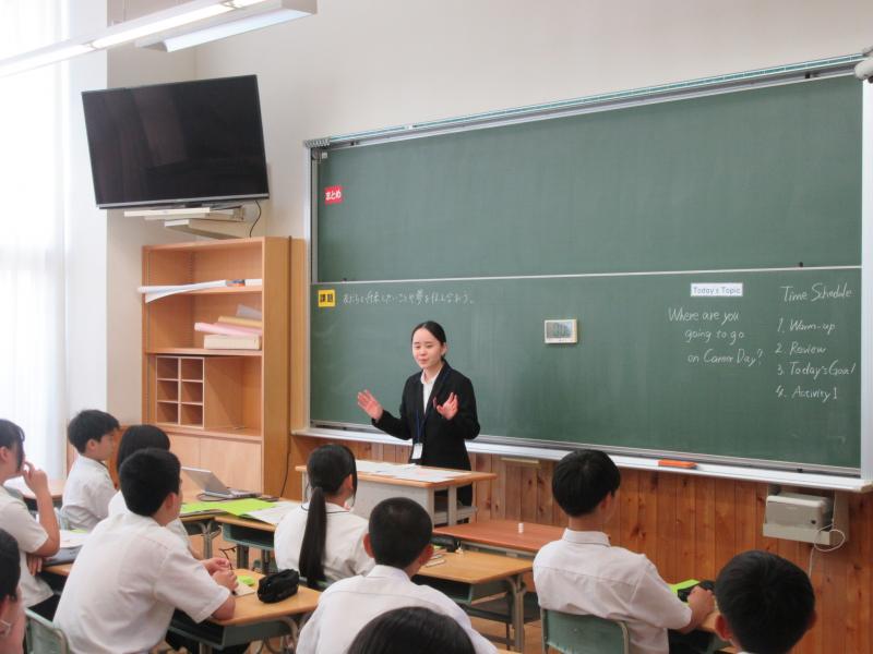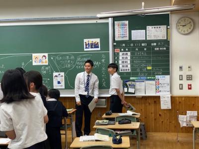 宮島先生の2週間の教育実習期間が本日で終了しました。宮島先生には、担当の授業や学級の道徳や学活など、生徒とともに活動をして頂きました。本日のお昼の放送で全校生徒に向けてお礼の言葉を述べていました。宮島先生は来年度、海外へ留学し、再来年度に石川県の教員採用試験に挑むということです。