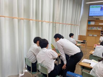 教育実習生の宮村先生が道徳の授業を行っていました。困っている高齢者を助けた友達とは違い何もできなかった「僕」は、さりげなく優しさを行動に移す大切さを考えていくという題材の授業でした。宮村先生の表情がとても良く、ペア学習にもそっと声をかける姿もあり、生徒は安心しており、大変良い雰囲気の授業となっていました。