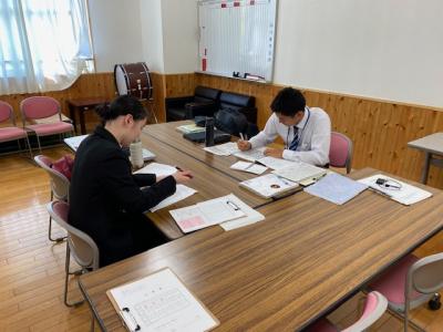 本日の放課後、若プロ研修会を行いました。今日は、教育実習生の2人も参加をして「ビジネスマナー」の1つである「話し方」の研修会を実施しました。