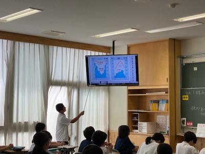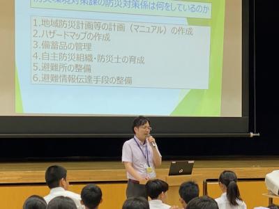 1年生の総合的な学習の時間では、「防災学習」をスタートしました。本日は、かほく市防災環境対策課の方に、かほく市の自然災害への備えや過去に起こった地震や水害での市内の様子などのお話しを聞きました。