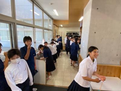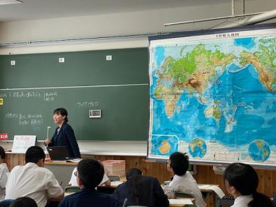 また社会科担当の先生は「掛け地図」を常に吊り下げており、ICTの活用も大切ですが、生徒には大変好評です。現在では「赤道を通る国」は?の質問に「ケニア」「ブラジル」「インドネシア」などどの生徒も大変スムーズに答えています。