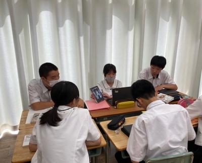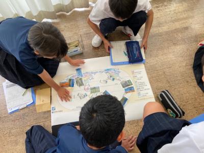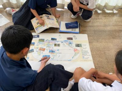 1年生の社会では、「世界にはどのような気候があるのか」という課題で授業を行っていました。景観写真と雨温図で読み取った特徴から世界地図のどの場所を示しているのか、グループで話し合っていました。「夏でも気温が10℃ってことは寒帯やよね。」「年間降水量が500mmだと砂漠気候かな。」などお互いの意見を伝えながら、場所を判断していました。