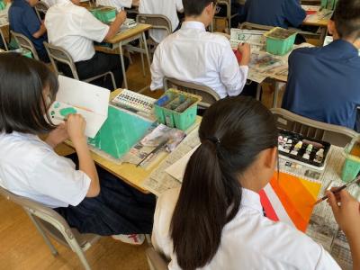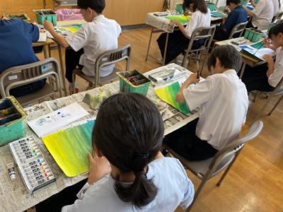 また1年生の美術の授業では、色の学習をしており、初めてアクリル絵の具を使用していました。筆の使い方や色を混ぜ合わせる時の絵の具の量など苦労しながら行っていました。