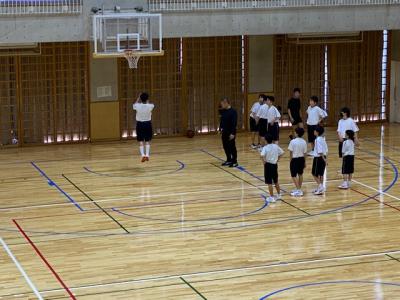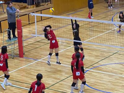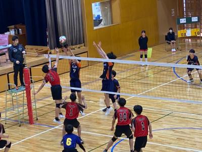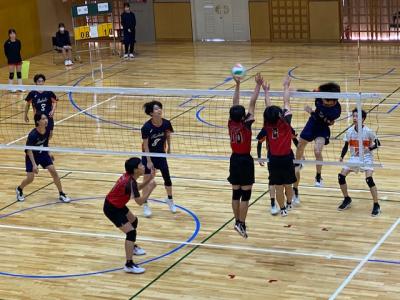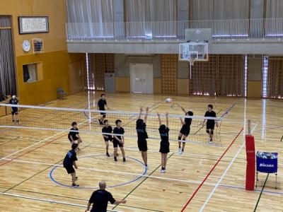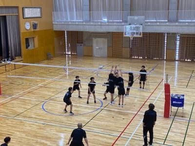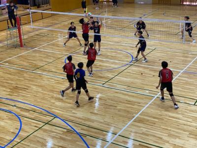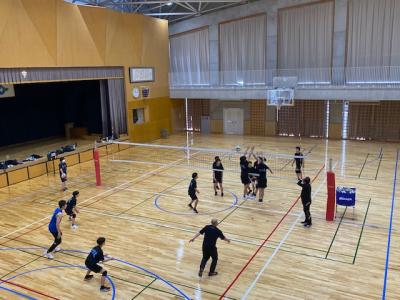 学校の体育館では、男子バレーボール部が本校ОBの方や地域の指導者が練習相手をしてくださり、ゲームを行っていました。1年生も頑張っています。