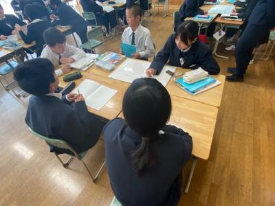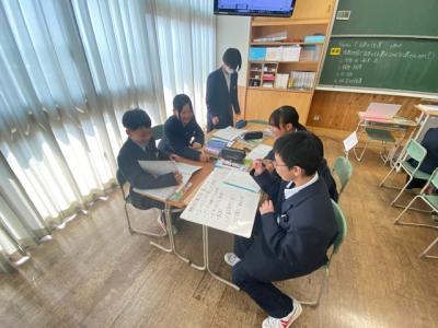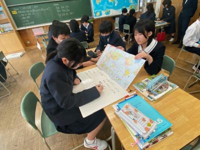 1年生の社会の時間では、「日本は地図上でどのような位置にあるかな」という課題で学習を行っていました。「太平洋の西側」「ユーラシア大陸の東側」「韓国の東側」などグループで多くの意見を出し合っていました。これから世界の国について、位置はもちろんですが、気候や様々な気候の暮らし方などを学習します。今年の1年生も、ペアやグループ学習がとても良い雰囲気でできています。小学校からの学びを私たち中学校でもしっかり繋いでいきたいと思います。