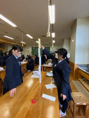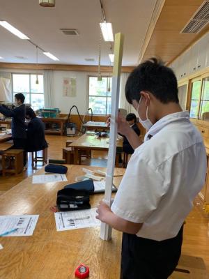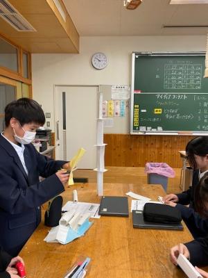 本日1年生の技術の授業では、紙7枚で、できるだけ高くタワーを作るにはどうすればよいか?を課題として学習をしていました。各グループで、紙を切ったり折ったりして、安定感や強度を考えながら組み立てていました。今日の最高記録は97㎝だったそうです。今後、折り方や積み上げ方を学び、目標は自分たちの身長だそうです。