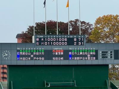 2025年11月9日 13時11分本日、栃木県エイジェックスタジアムにおいて、標記大会の準決勝が行われ、かほく市軟式野球クラブは、地元栃木県の作新学院中等部と戦いました。130キロを超える球を投げるピッチャー相手に果敢に攻め、3回裏には逆転しましたが、5回表に追いつかれ、同点となり特別延長8回に6点を取られ、2-8で敗退しました。選手は最後まで諦めずに戦ってくれました。昨日、今日と3試合、多くの方に応援して頂き、多くの経験をしたと思います。胸を張って帰って来てください。本当にお疲れ様でした!