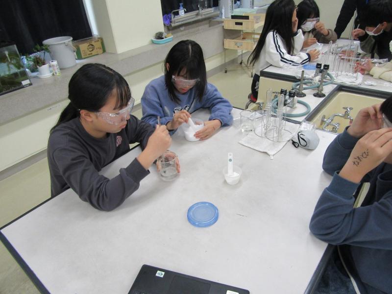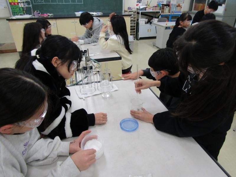 物の溶け方の実験です。保護メガネを着用しています。